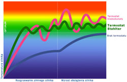 | Każdy silnik zaprojektowany jest tak, aby pracował w ściśle określonej temperaturze (tolerancja temperatury otwierania termostatu powinna się mieścić w przedziale od ±1,5°C do ±3,0°C). Ze względu na ograniczenie emisji szkodliwych związków chemicznych, jak najniższe zużycie paliwa oraz utrzymanie maksymalnej sprawności silnika, istotne jest jak najszybsze uzyskanie jego właściwej temperatury i utrzymywanie jej niezależnie od zmieniających się warunków pracy. Dodatkowo, w zimie, właściwa temperatura silnika zapewnia dobre ogrzewanie wnętrza pojazdu. Aby spełnić te wymagania i uniknąć zniszczenia silnika, w układzie chłodzenia niezależnie od pory roku, musi pracować sprawny i dobrej jakości termostat. | | Prezentacja działania termostatu STAHLTER  obejrzyj